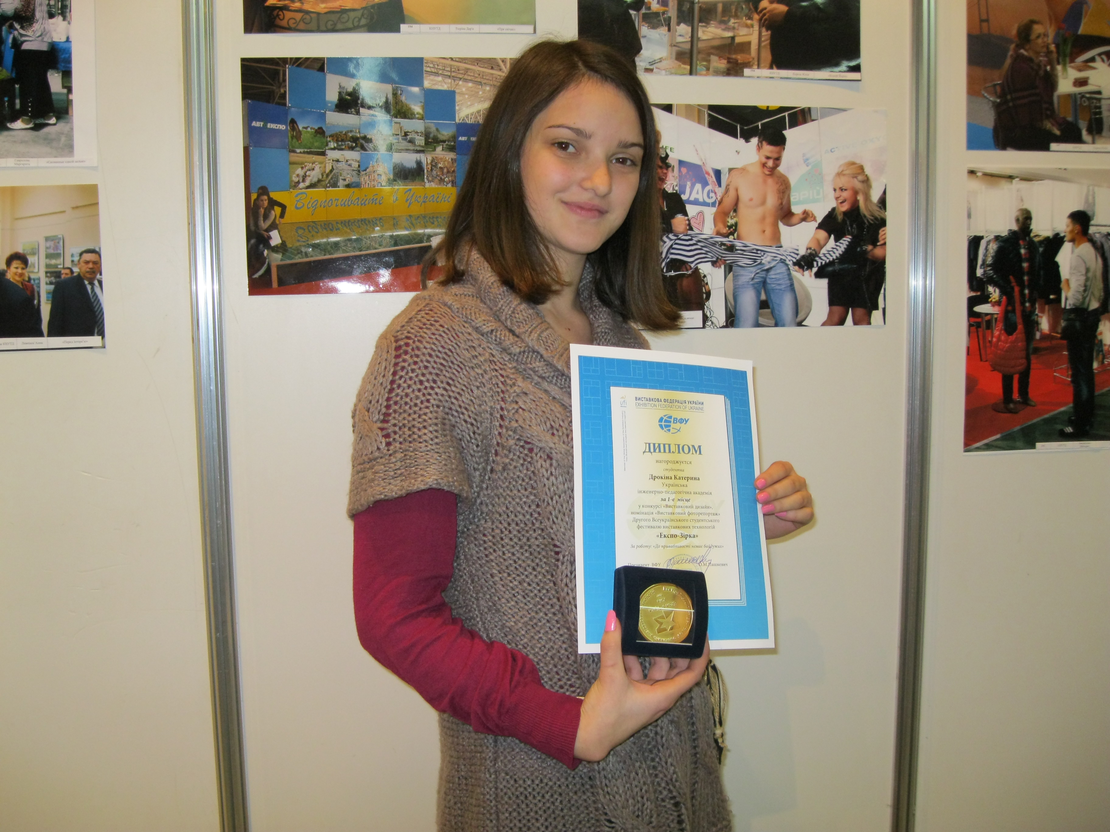 Дрокіна Катерина, студентка гр.ДТ-С10-1 отримала золоту медаль за перше місце у конкурсі “Виставковий дизайн” Другого Всеукраїнського студентського фестивалю виставкових технологій “Експо-Зірка” (керівник Залкінд В.В.). Церемонія нагородження відбулась 17.11.11 на міжнародній спеціалізованій виставці “Освіта та кар’єра – День студента” (Центр ділового та культурного співробітництва “Український дім” м. Київ, вул. Хрещатик, 2).